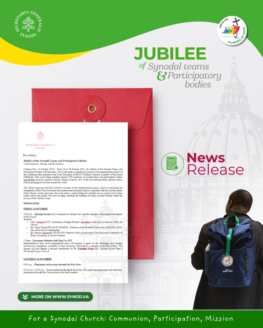 (Ciudad del Vaticano, 22 de octubre de 2025) - Del 24 al 26 de octubre de 2025 se celebrará el Jubileo de los equipos sinodales y los organismos de participación, un evento que marca un ...